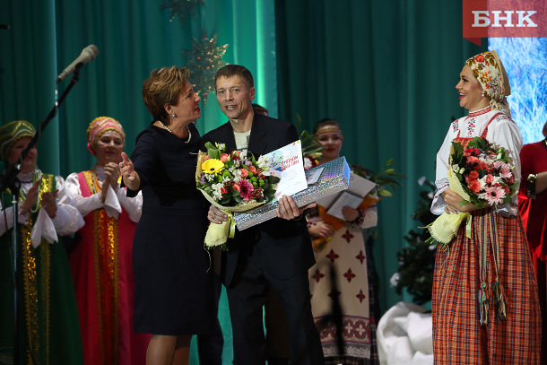 Депутат Госсовета Коми Татьяна Саладина собственный приз вручила юбиляру — Василию Чувьюровву — теплый плед для теплых творческих вечеров.