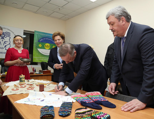 Затем представитель президента и сопровождающие его лица погостили у национальных и культурных автономий. В первую очередь заглянули в кабинет движения «Коми войтыр». Душевной коми песней, вкуснейшей выпечкой и традиционным суром гостей приветствовали руководитель движения Алексей Габов, секретарь Григорий Хатанзейский и милые дамы в национальных нарядах. Они рассказали о работе движения, традициях и культуре коми народа, вручили подарки, а затем попросили дорогих гостей оставить автографы на скатерть ручной работы. Подписи позже будут вышиты рисунком.