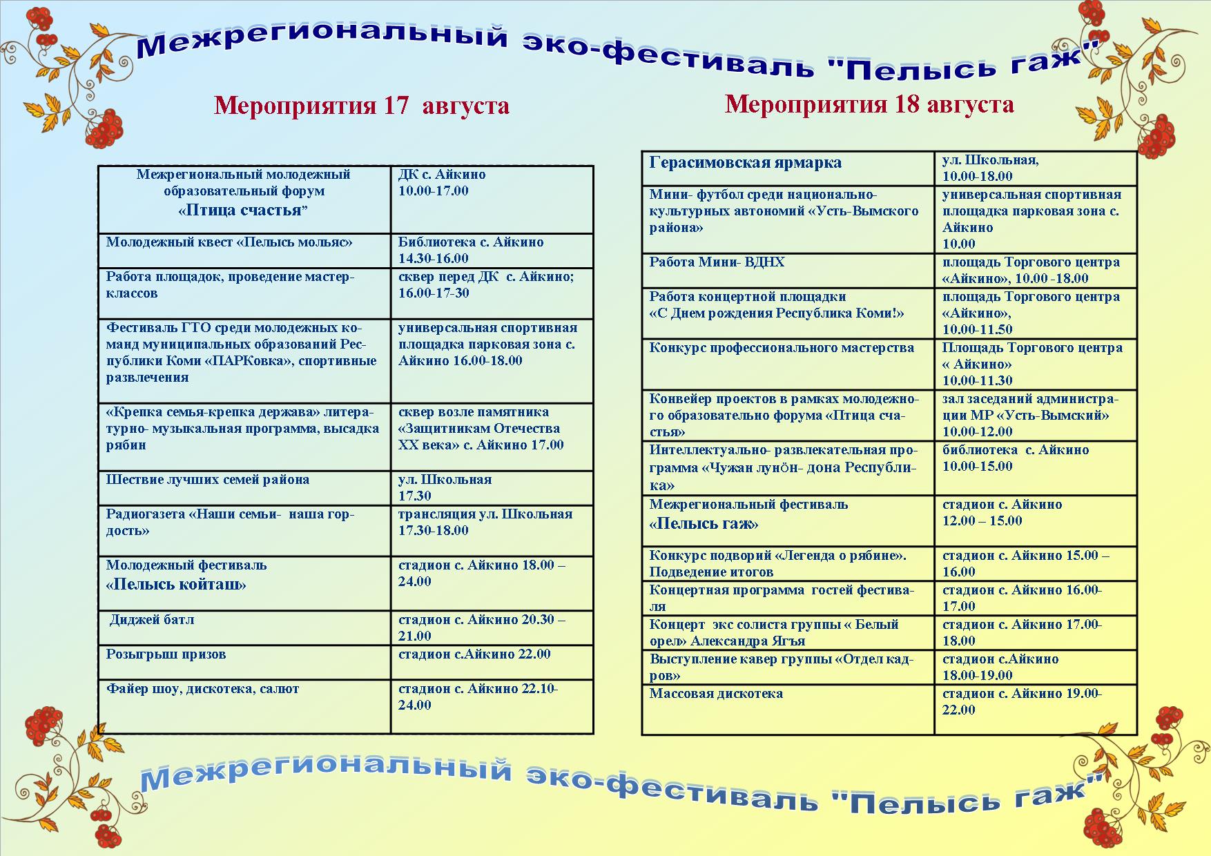 17-18 августа в селе Айкино Усть-Вымского района пройдет Межрегиональный эко-фестиваль «Пелысь гаж» («Именины у рябины») в рамках объявленного в регионе Года культуры. Это мероприятие даст старт празднованию 97-летия со дня образования Республики Коми.