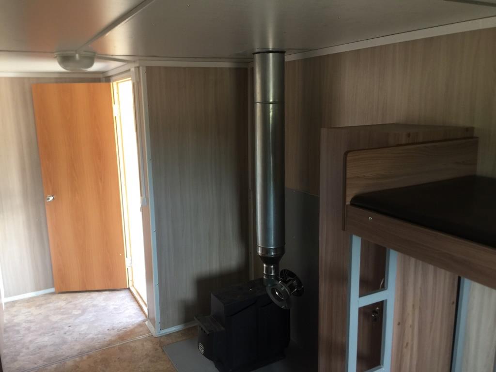 Модуль полностью оснащен и готов для проживания. В длину – 10 метров, двухскатная крыша, пластиковые окна с москитной сеткой, печное и электрическое отопление, освещение, канализация, умывальник с электроводонагревателем. Из мебели имеются кровати, шкаф, стол и табуретки, тумбы.