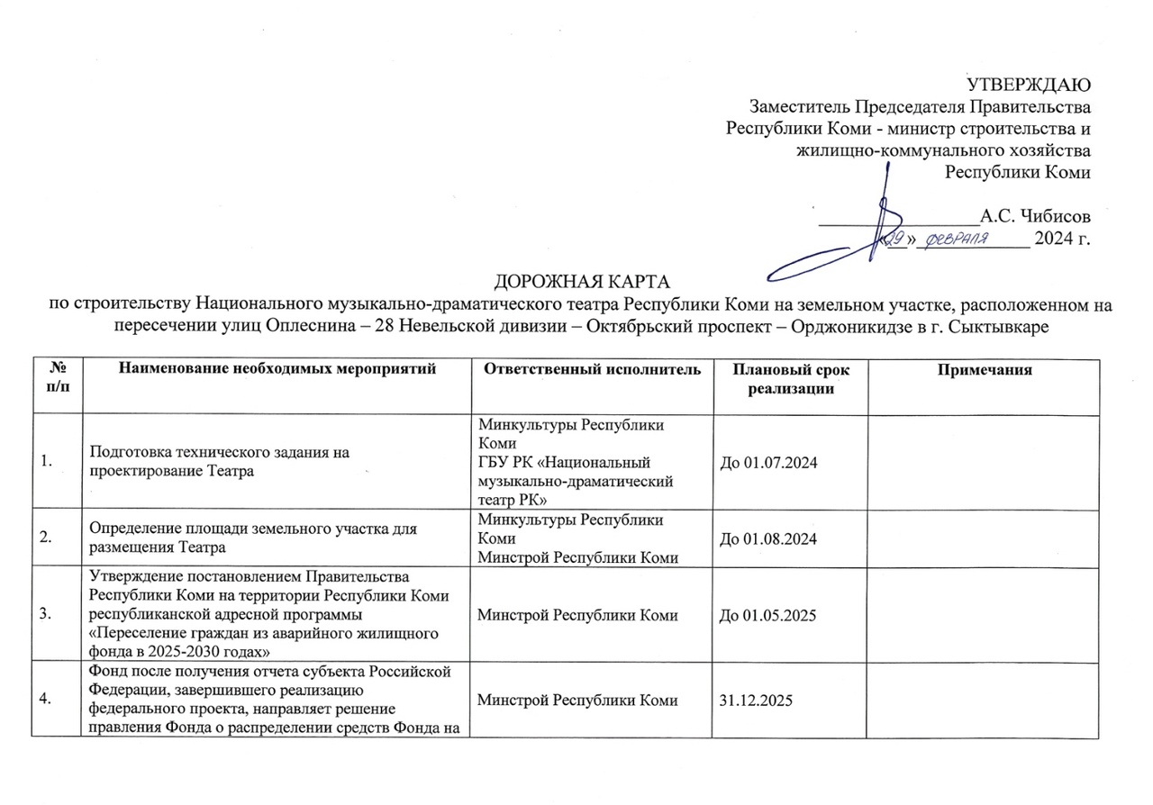 Публикуем дорожную карту строительства ( Дорожная карта-коми театр 2024 ), утвержденную заместителем Председателя Правительства РК - министром строительства и жилищно-коммунального хозяйства РК Чибисовым А.С. В дальнейшем будем вместе контролировать ход исполнения данной дорожной карты. Надеемся, что сроки исполнения по отдельным направлениям удастся проводить с опережением установленного графика.