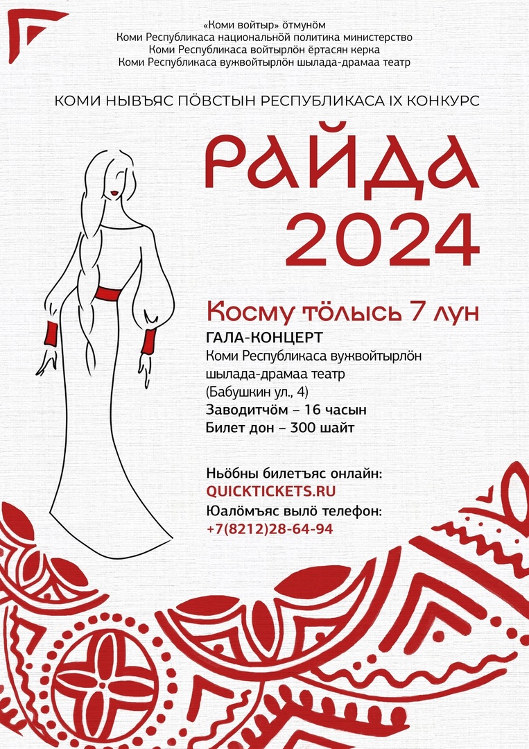 Результаты IX республиканского конкурса коми девушек «Райда-2024» будут оглашены на Гала-концерте, который состоится 7 апреля в 16.00 в Национальном музыкально-драматическом театре Республики Коми. Все участницы будут награждены дипломами, подарками от организаторов и партнёров конкурса.