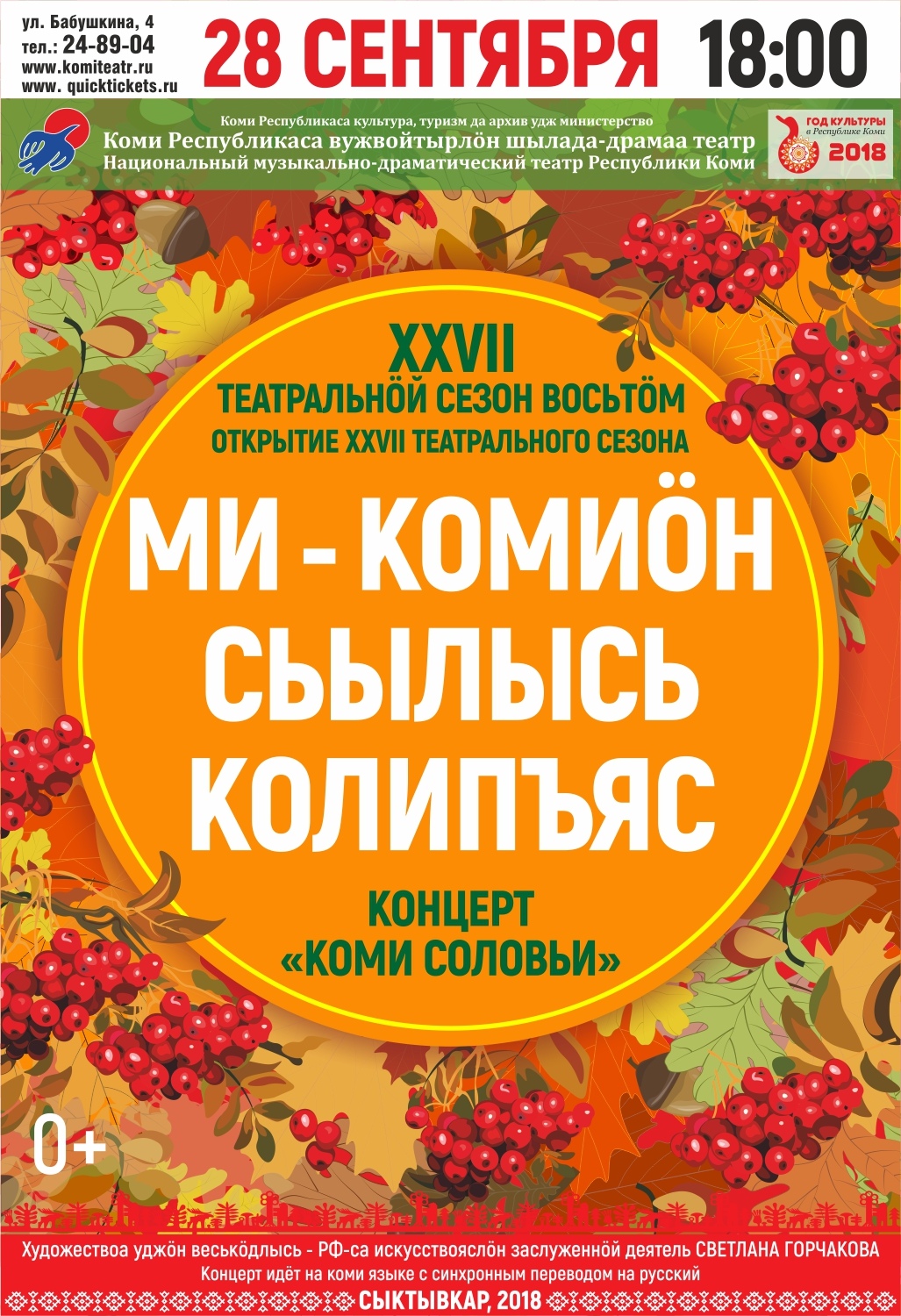 На этой неделе открывает XXVII творческий сезон Национальный музыкально-драматический театр Республики Коми. Вечером 28 сентября зрителям представят концерт «Ми – комиöн сьылысь колипъяс» («Коми соловьи»). Прозвучат как народные песни, так и песни современных авторов.