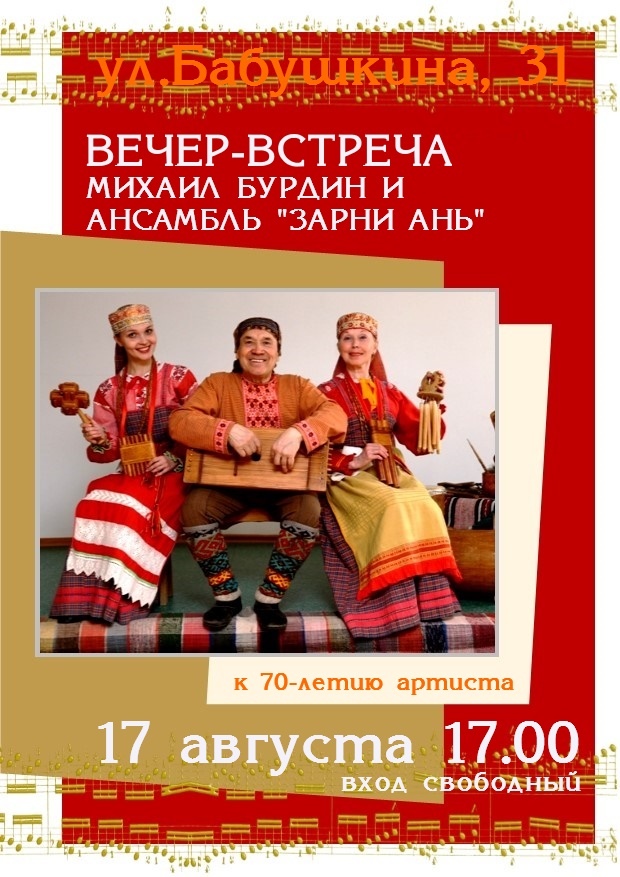 Друзья! Приглашаем вас на вечер-встречу с любимыми артистами - Михаилом Бурдиным и ансамблем "Зарни ань"!