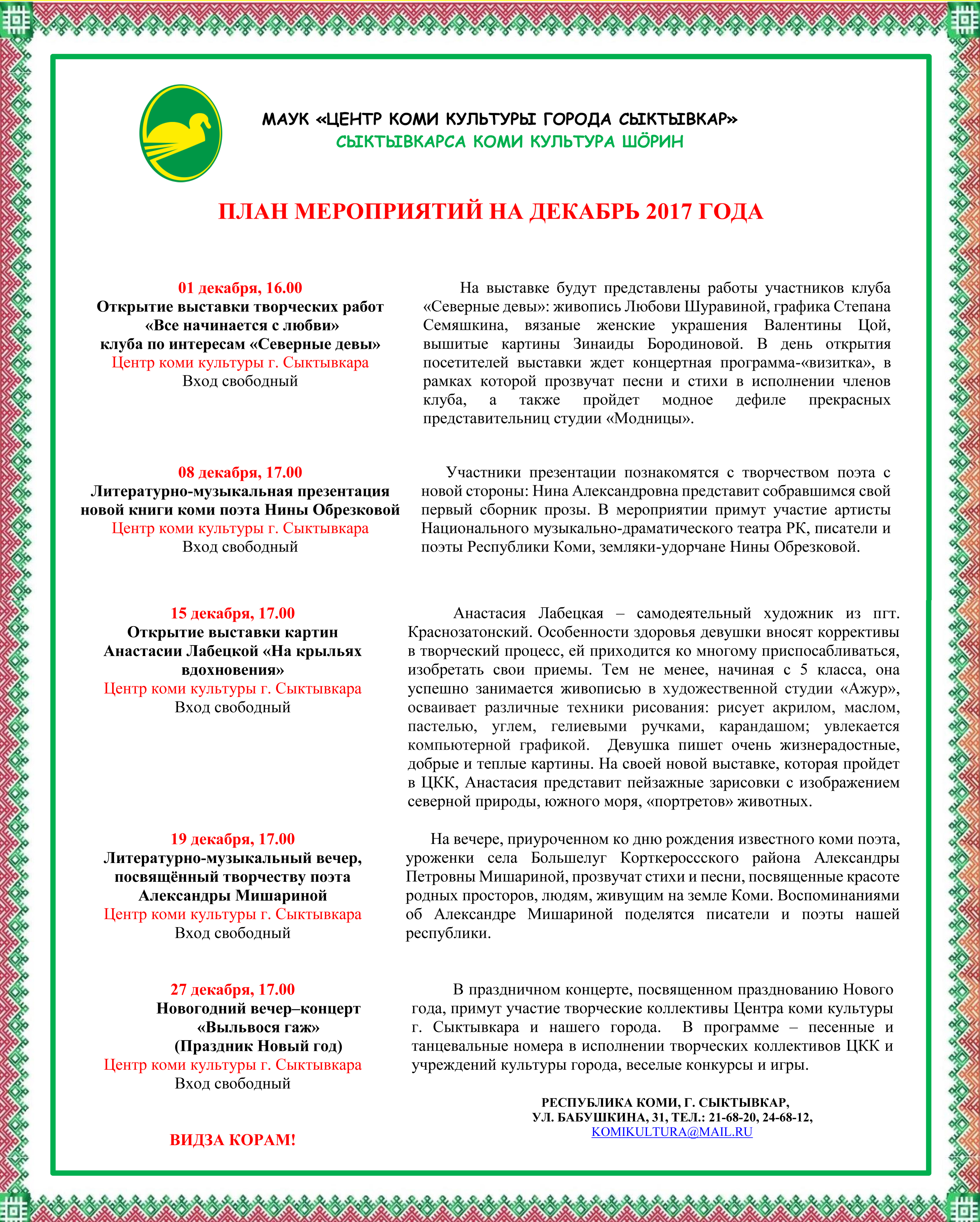 Миян республикаын да ставнас странаын нималана артисткаӧс чолӧмавны, быд бурсӧ сылы сины чукӧртчыласны уджъёртъясыс да искусство радейтысьяс, сцена вылын сылысь ворсӧмсӧ вылӧ донъялысьяс.