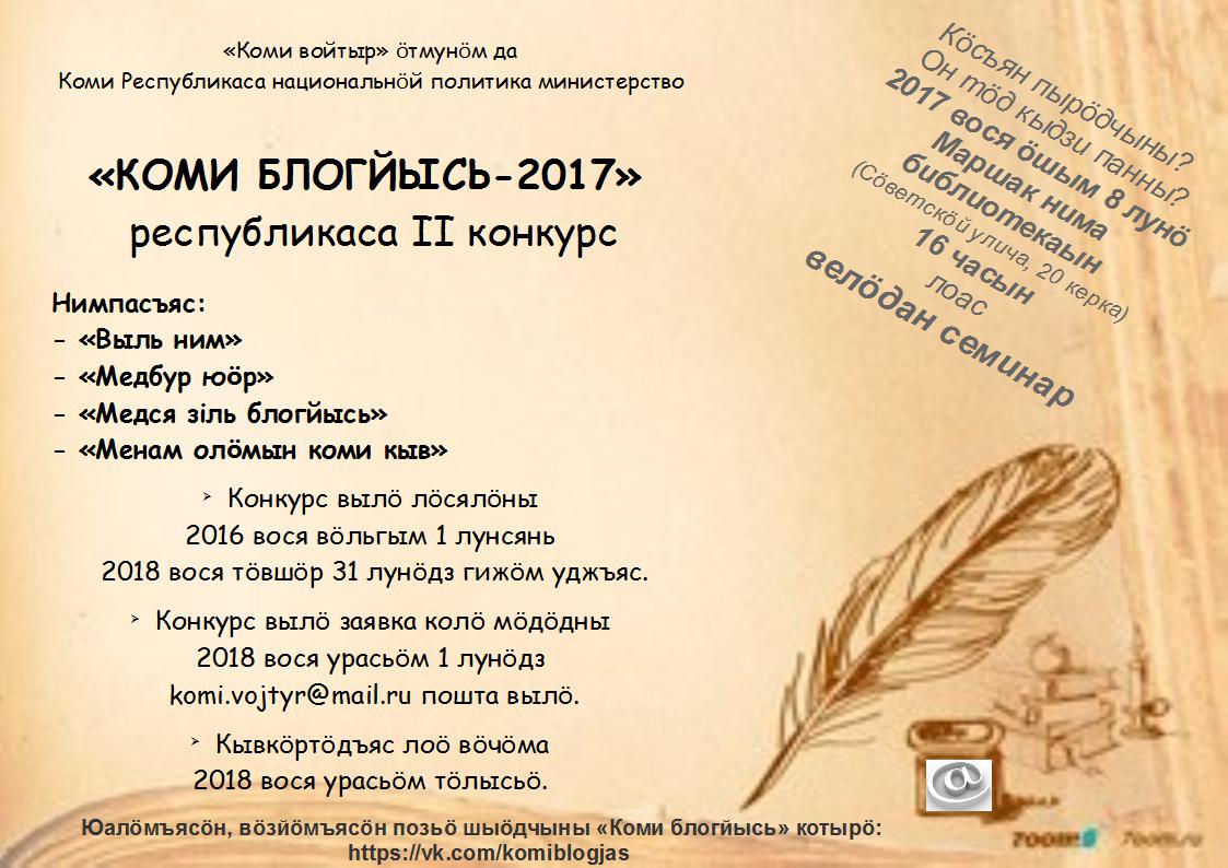 Коми республикаса национальнӧй политика министерство да "КОМИ ВОЙТЫР" ӧтмунӧм юӧртӧны "КОМИ БЛОГЙЫСЬ" республикаса II конкурс йылысь. Виччысям заявкаяс. А сыӧдз, ӧшым тӧлысь 8 лунӧ 16 чассянь С.Маршак нима челядьлы библиотекаын лоас велӧдан семинар.
