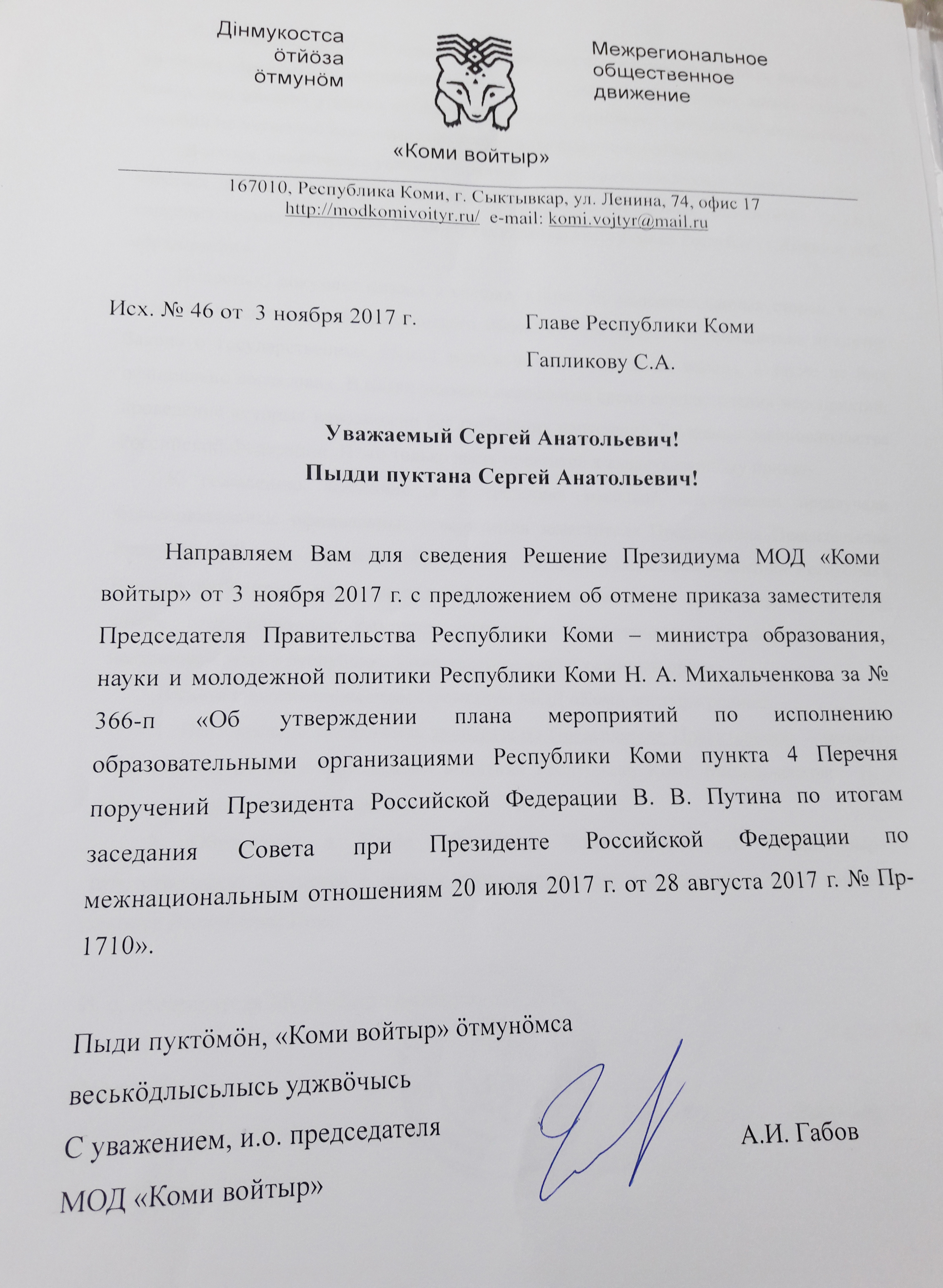 2017 вося октябрь 26 лунӧ Коми Республикаса Правительствоӧн веськӧдлысьӧс вежысь — велӧдӧм, наука да том войтырлӧн политика кузя министр Н.А.Михальченкова кырымаліс «Об утверждении плана мероприятий по исполнению образовательными организациями Республики Коми пункта 4 Перечня поручений Президента Российской Федерации В. В. Путина по итогам заседания Совета при Президенте Российской Федерации по межнациональным отношениям 20 июля 2017 г. от 28 августа 2017 г. № Пр-1710» 366-п №-а тшӧктӧм. Кабалаыс шызьӧдіс регионын олысьясӧс.